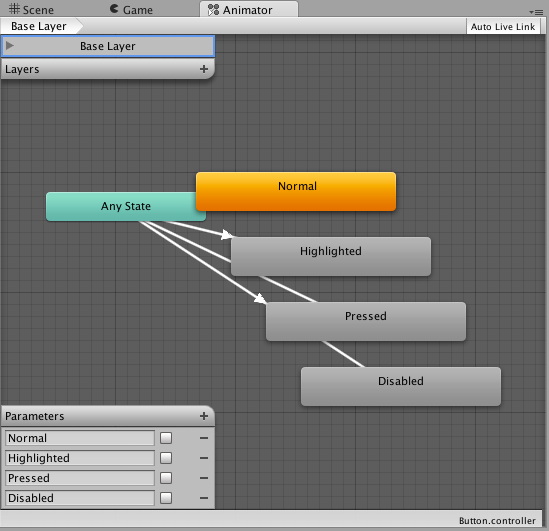 Animation allows for each transition between control states to be fully animated using Unity's animation system. This is the most powerful of the transition modes due to the number of properties that can be animated simultaneously.